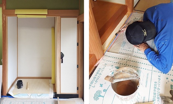 仏間の唐紙の一部を再利用・加工して収納扉を設置した。